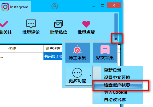切换到【Instagram】功能列表,点击【更多功能】选择【cookie导入】支持的第1种Cookie格式,FB账户----密码----地区----Cookie支持的第2种Cookie格式,Cooki...